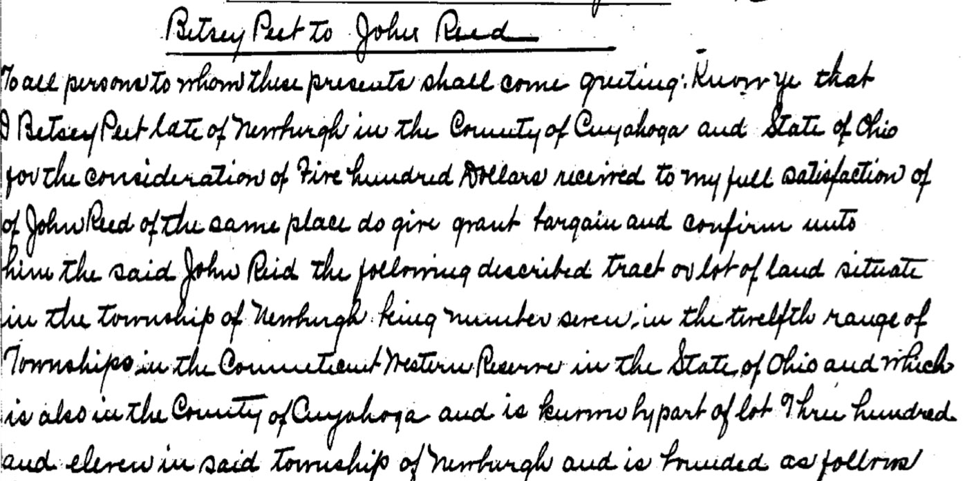 Originally part of the three million acres of the Western Reserve in Newburgh Township. The land was purchased in 1795 for $1.2 million by 58 investors of the Connecticut Land Company. The earliest ownership of 100 acres parcel #311 appears to be Betsey Peek, a prominent early settler who arrived in the Western Reserve about 1812.