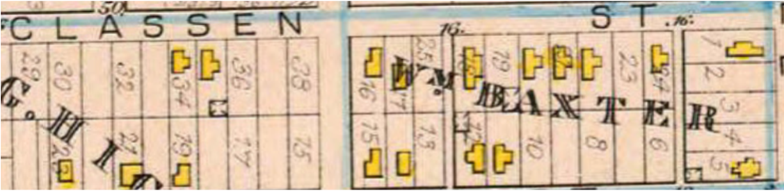 Baxter created sub-lots for sale creating 24 parcels of land. The street name was converted from Orchard Street to Claasen Ave.