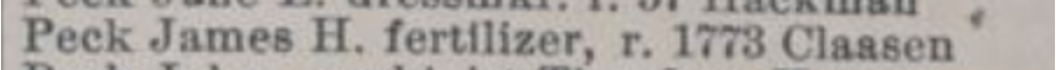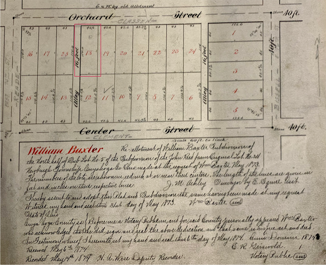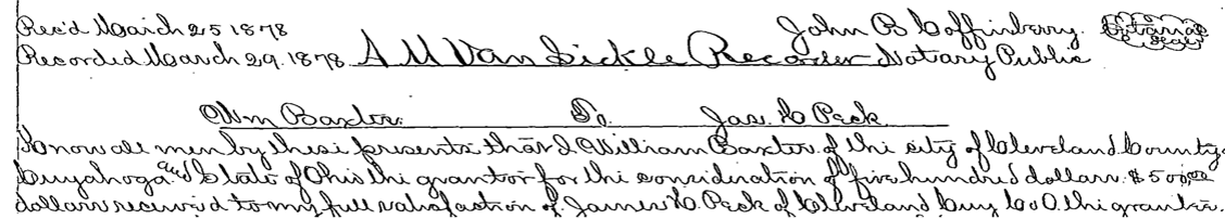 In March 1878 Baxter sells sublot 18 for $500 to James Harrison Peck. The alley adjacent to the west of the property eventually becomes a shared driveway with sublot 25. Peck was a 38 year old established provision dealer from Brecksville. Peck also purchases several other lots on Claasen including part of parcel 19.